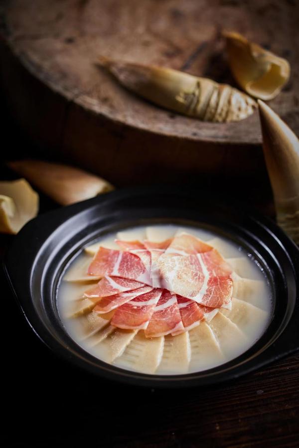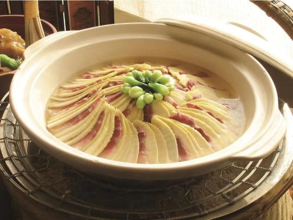 Bamboo Shoots from Mt. Wenzheng Cooked with Sausage and Dried Mushroom.This dish is a traditional flavor in Huizhou mountainous area. Cooked with sausage and dried mushrooms, the bamboo shoots are more fragrant. It is delicious, and noted for its good color, juicy meat and thick soup.