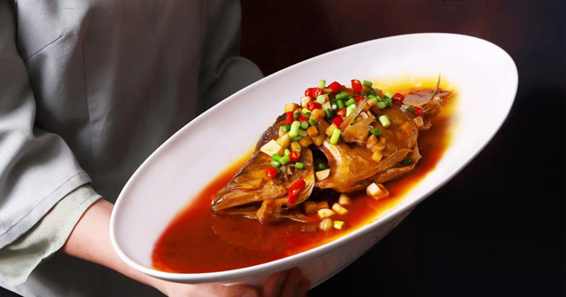 工艺流程:臭鳜鱼洗净打花刀;五花肉丁炒至出油,下生姜、蒜子,臭鳜鱼两面煎至封皮;加入黄酒、老抽、白糖、高汤;大火收汁,汤汁浓稠后出锅。