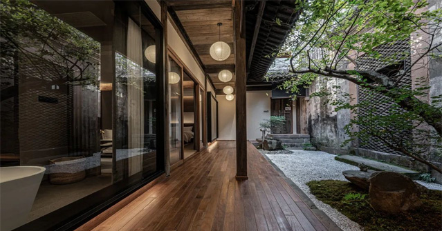 蔓园见山现主人耗时四年有余,对院内四栋古宅建筑及周边园林建筑进行修缮和重建,让它赋予新貌。设计师依托古建原址,大量运用传统工艺及现代技术,将院内多处建筑进行完美呈现,再现明清时期民居的典雅庄重、工艺精美的建筑风采。