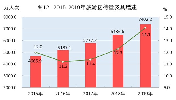 全年接待海内外旅游者7402.21万人次,比上年增长14.1%。其中,接待国内游客7115.27万人次,增长14.3%;接待入境旅游者286.94万人次,增长9.2%。在入境旅游者中,外国人163.72万人次,增长2.8%,港澳台同胞123.22万人次,增长19.1%。旅游总收入659.45亿元,增长15.1%。其中,旅游外汇收入9.30亿美元,增长10.5%;国内旅游收入595.19亿元,增长15.1%。年末全市有A级及以上旅游景点(区)48家53处,其中5A级景区3家8处;星级饭店33家,其中四星级及以上饭店24家;旅行社212家。