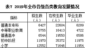 年末全市有普通高校2所,普通本专科在校生22604人。高考文理本科达线率63.6%。各类中等职业教育(不含技工学校)15所,在校生16413人。普通高中20所,在校生19550人,高中阶段毛入学率107.96%。普通初中94所,在校生35372人,初中阶段适龄人口入学率100%。小学131所,在校生71646人,小学学龄儿童入学率100%。幼儿园199所,在校生37844人,学前三年毛入园率107.33%。特殊教育学校2所,在校生139人。