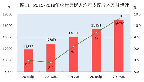 全年农村常住居民人均可支配收入16970元,比上年增长10.3%,从农村常住居民收入结构来看,人均工资性收入6561元,增长8.7%,经营净收入6764元,增长11.2%;财产净收入276元,增长15.7%;转移净收入3369元,增长11.1%。农村居民人均消费支出13412元,增长7.6%,其中食品烟酒支出增长8.8%,衣着增长6.7%,居住增长5.1%,生活用品及服务增长2.7%,交通和通信增长0.1%,教育文化娱乐服务增长20.4%,医疗保健增长16.2%。农村常住居民恩格尔系数为32.8%,比上年上升0.4个百分点。年末农村常住居民人均住房建筑面积69.4平方米,比上年增加3.9平方米。