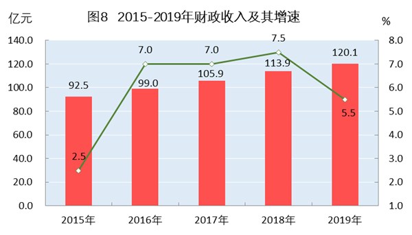 全年财政收入120.1亿元,比上年增长5.5%,其中地方财政收入81.1亿元,增长4.4%。全部财政收入中,税收收入79.0亿元,增长3.5%,其中,增值税、企业所得税分别增长5.8%和13.1%,个人所得税下降29.2%。税收收入占全部财政收入的比重为65.8%,同比回落1.2个百分点。