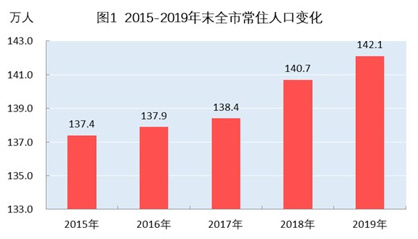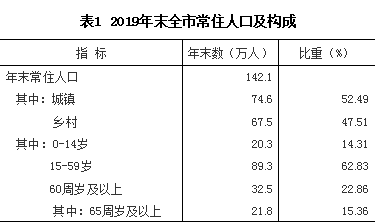 年末全市户籍人口148.92万人,比上年末增加0.34万人;户籍人口城镇化率35.76%,比上年末提高1.38个百分点。常住人口142.1万人,增加1.4万人;常住人口城镇化率52.49%,提高1.03百分点。全年人口出生率11.03‰,比上年下降0.76个千分点;死亡率6.29‰,下降0.10个千分点;自然增长率4.74‰,下降0.66千分点。