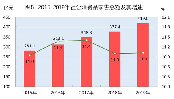 全年社会消费品零售总额419.0亿元,比上年增长11.0%。按经营地统计,城镇消费品零售额349.5亿元,增长10.9%;乡村消费品零售额69.6亿元,增长11.7%。按消费类型统计,商品零售额333.8亿元,增长10.9%;餐饮收入额85.3亿元,增长11.3%。按单位规模统计,限额以上单位零售额113.0亿元,增长10.8%;限额以下单位零售额306.1亿元,增长10.9%。全市纳入统计的34家开展网络零售业务的限额以上批发零售企业实现网上零售额5.75亿元,增长2.4%。
