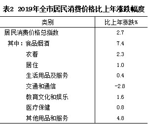 全年居民消费价格(CPI)比上年上涨2.7%,其中食品烟酒价格上涨7.4%。商品零售价格上涨2.2%。工业生产者出厂价格下降0.9%,工业生产者购进价格下降3.4%。