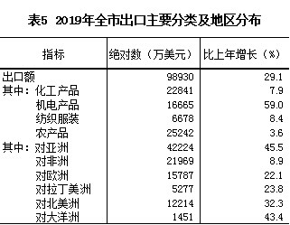 全年进出口总额11.58亿美元,比上年增长21.7%。其中,出口9.89亿美元,增长29.1%;进口1.69亿美元,下降8.8%。从贸易方式看,一般贸易进出口11.01亿美元,增长22.4%;进料加工贸易0.56亿美元,增长9.8%。