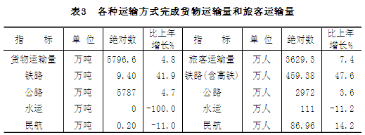全年各类运输方式完成货运总量5796.6万吨,比上年增长4.8%。其中,公路5787万吨,增长4.7%;水运0万吨[3],下降100%;铁路9.40万吨,增长41.9%;民航货邮吞吐量0.20万吨,下降11.0%。完成旅客运输总量3629.3万人,比上年增长7.4%。其中,公路2972万人,增长3.6%;水运111万人,下降11.2%;铁路(含高铁)459.38万人,增长47.6%;民航旅客吞吐量86.96万人,增长14.2%。年末,全市公路线路里程7364公里,其中高速公路353公里。