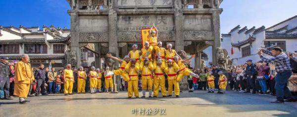 叠罗汉为流行于歙县叶村的一种民间游艺。表演时演员下穿红彩裤,上身赤膊光膀,面部绘有脸谱。演员均为男性,表演浑朴粗犷。演出前举行祭台仪式,焚纸烧香、罗汉扫堂,然后从演员相继登台或在广场上表演。演员不说不唱,在大鼓敲击的简单节奏下,分别表演童子拜观音、斜角旗、仙人桥、石猴出山、水帘洞、刘海戏金蟾等造型。