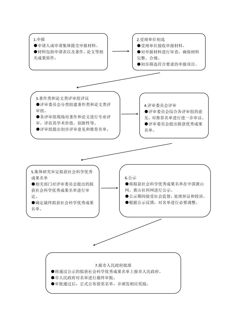 评定程序分为申报、受理单位初选、著作类和论文类评审组评议、评审委员会评审、集体研究审定拟获社会科学优秀成果名单、公示、报市人民政府批准等7个环节。