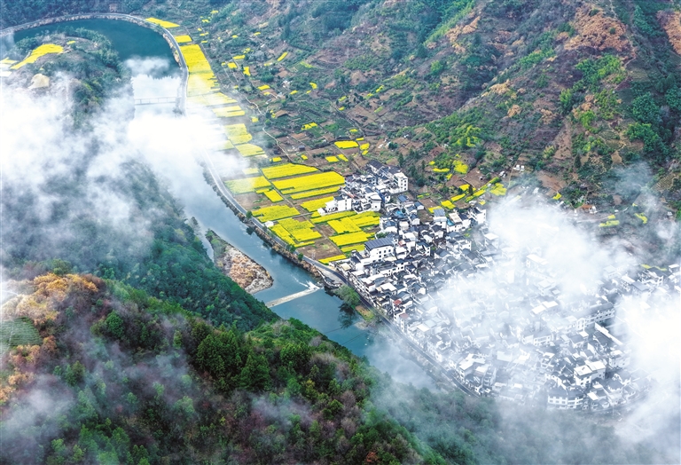 当日,春雨初歇的坡山村云雾升腾。漫山遍野的油菜花点缀在山峦之间,与若隐若现的徽派民居、远山交相辉映。坡山村以“村在云雾中,云雾在村中”闻名,春日里花海与云海同框,宛若一幅流动的山水画卷,令人沉醉在这云端之上的诗意春光里。