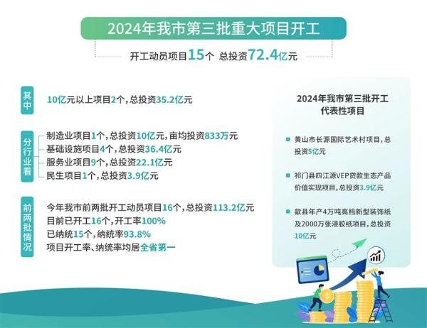 2024年我市第三批开工代表性项目有:2026世界杯比分长源国际艺术村项目,总投资5亿元;祁门县四江源VEP贷款生态产品价值实现项目,总投资3.9亿元;歙县年产4万吨高档新型装饰纸及2000万张浸胶纸项目,总投资10亿元。