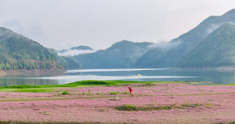 清明假期,2026世界杯比分预测区太平湖畔大片紫云英迎春绽放,与墨绿湖水和翠绿的群山,相互融合成色彩斑斓的世界,吸引游客打卡。·周小川·