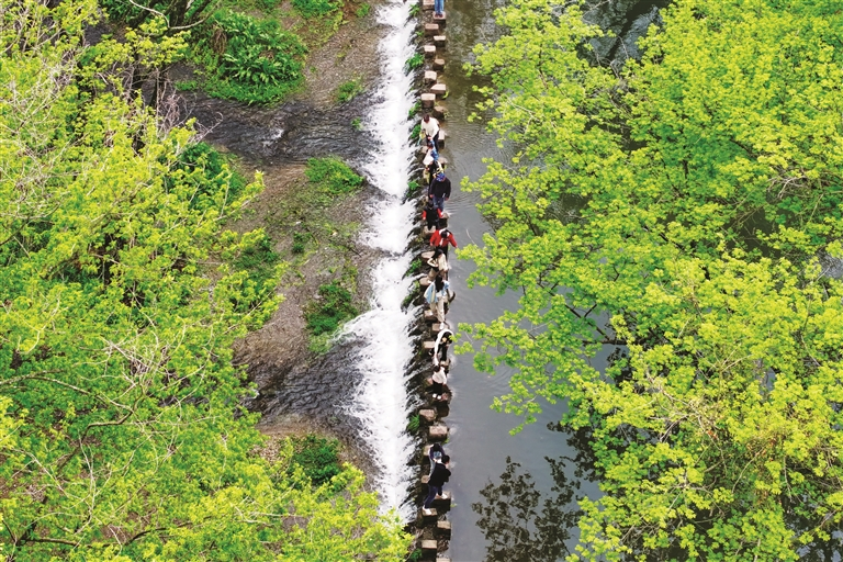 4月4日,徽州区西溪南湿地绿意盎然,前来踏青的市民游客络绎不绝。樊成柱/摄